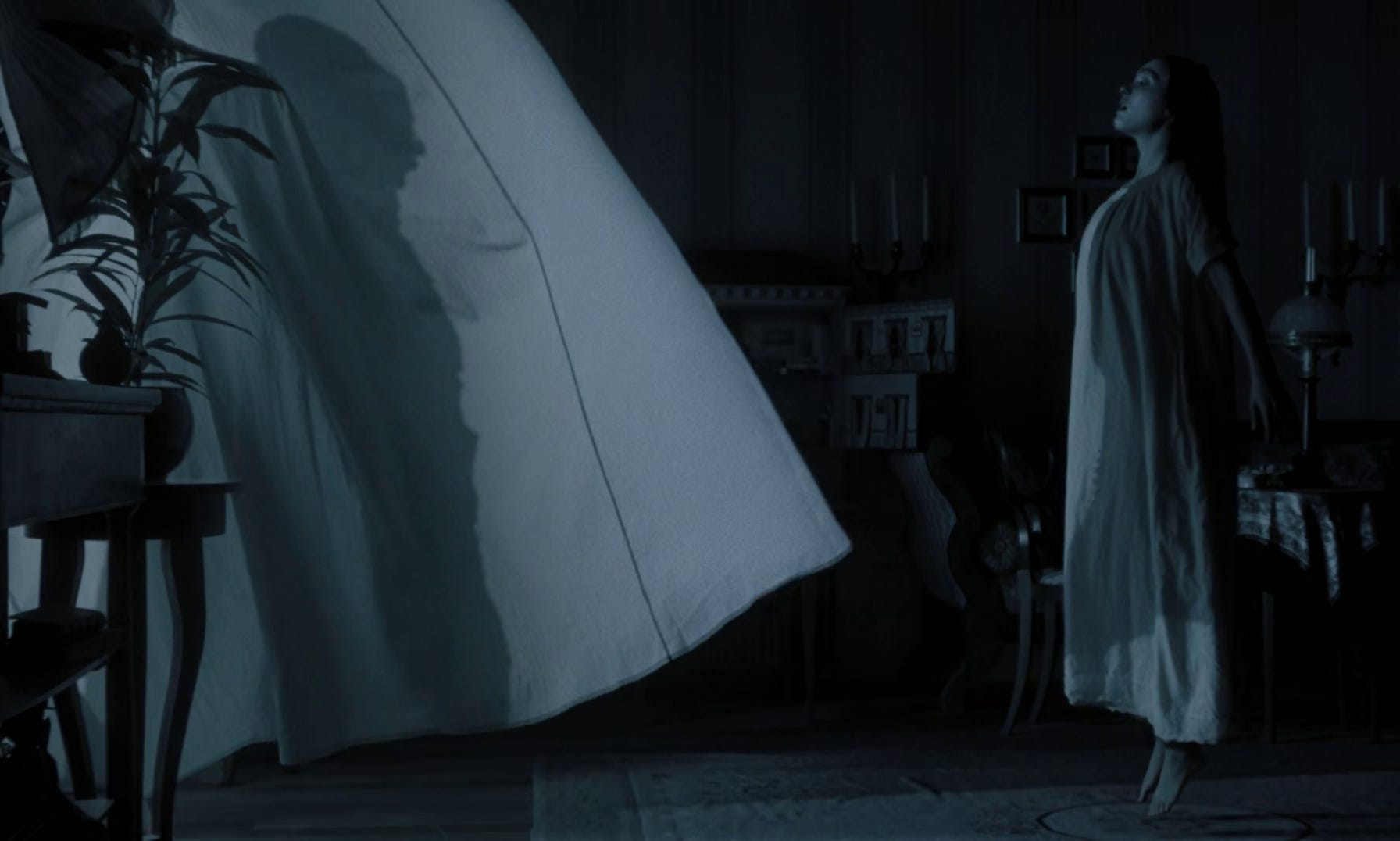Ellen Hutter (Lily-Rose Depp) is a somnambulist terrorized by night visions, violent seizures, and bouts of sleepwalking. By her own account, these episodes began in her teenage years, in a moment of loneliness where Ellen sought the company of “a guardian angel, a spirit of comfort” through a prayerful plea to the infinite. She receives a psychic reply, our first encounter with the vampire Count Orlock (Bill Skarsgård) through a disembodied absent projection of his buzzing, guttural speaking voice in some indecipherable ancient language. After she is swept trembling into the reliving embrace of a shadowy figure, the voice proposes: “And shall you be one with me ever-eternally. Do you swear it?” When Ellen agrees, the maggoted corpse-like Orlock suddenly appears to firmly grasp her throat, then quickly vanishing from our view as we watch Ellen violently contort and seize outside in her garden.